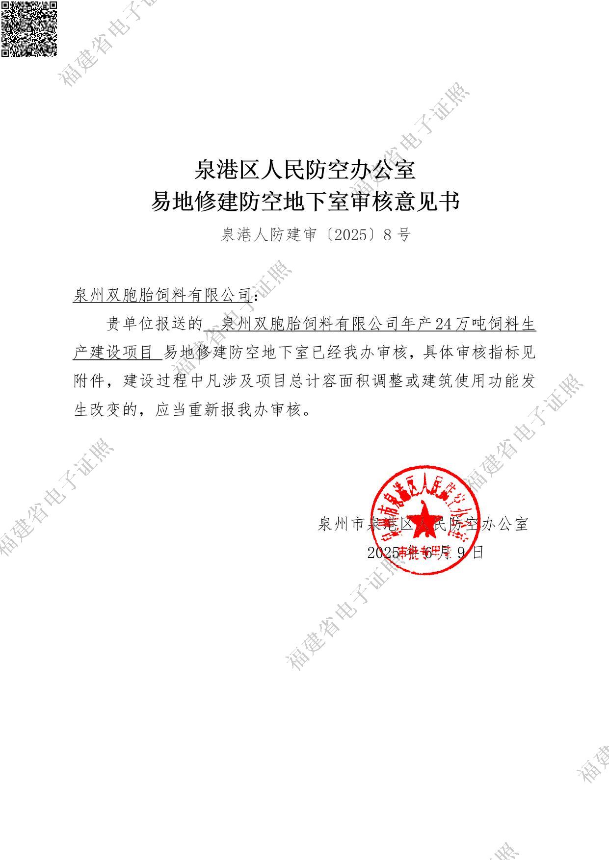 泉州双胞胎饲料有限公司年产24万吨饲料生产建设项目易地修建防空地下室审核意见书